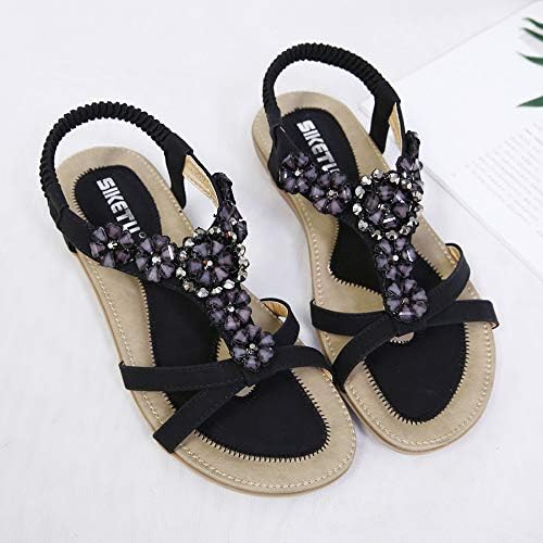 Böhmisches Strass-Design. Diese eleganten Sandalen verfügen über leichte Luxus-Strasssteine und künstliche Edelsteindekorationen, ein klassisches böhmisches T-Riemen und ein 0,5 cm flacher Absatz machen Sandalen bequemer und charmanter. Rutschfeste Gummisohle. Hochwertige Gummi-Außensohle, bietet hervorragenden Halt und Komfort, bietet die Traktion und Unterstützung, die Sie den ganzen Tag brauchen. Verstellbarer Knöchelriemen. Elastischer T-Riemen und verstellbarer Knöchelriemen für einfaches An- und Ausziehen.