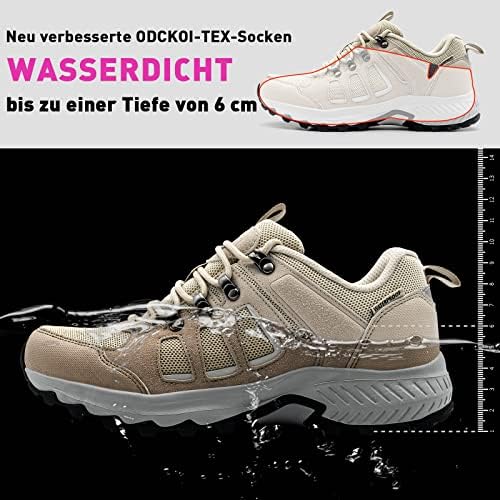 Innenmaterial: 100 % wasserdichte und atmungsaktive Trekkingschuhe für Damen mit wasserdichtem, atmungsaktivem ODCKOI-TEX, das Ihre Füße den ganzen Tag über trocken und bequem hält, indem Dampf entweichen kann, ohne dass Wasser eindringt; Das Außenmaterial ist mit einem PFC-freien wasserabweisenden Mittel behandelt, damit Sie einen verbesserten wasserdichten Schutz erhalten.