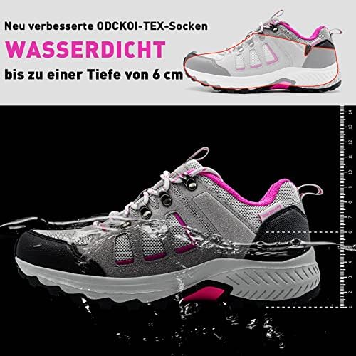 Innenmaterial: 100 % Wasserdicht und Atmungsaktiv trekkingschuhe damen wasserdicht verfügt über eine wasserdichte, atmungsaktive ODCKOI-TEX, die Ihre Füße den ganzen Tag über trocken und bequem hält, indem Dampf entweichen kann, ohne dass Wasser eindringt; das Außenmaterial ist mit einem PFC-freien wasserabweisenden Mittel behandelt, damit Sie es können erhalten Sie einen verbesserten wasserdichten Schutz.